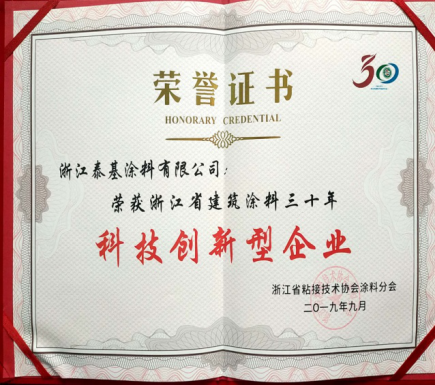 浙江泰基涂料有限公司獲得“浙江省建筑涂料三十年優(yōu)秀企業(yè)”榮譽(yù)稱號(hào)??偨?jīng)理周航帆獲得“浙江省建筑涂料三十年優(yōu)秀企業(yè)實(shí)力新人獎(jiǎng)”。
